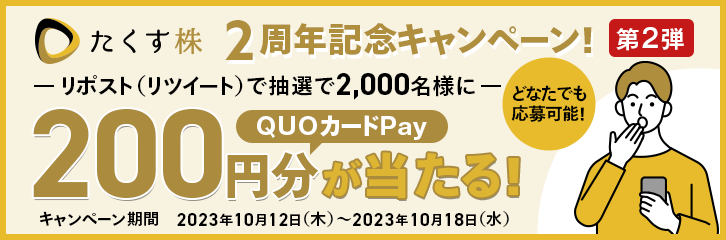 2023年9月、株式について認知症発症時の財産管理や相続時のスムースな資産承継を「信託」の仕組みを使ってサポートするサービス「たくす株」がリリースされて2周年を迎えました。日頃のご愛顧に感謝し、たくす株2周年記念キャンペーン第2弾として、X(旧Twitter)でキャンペーンポストをリポスト(リツイート)いただいた方の中から抽選で2,000名にQUOカードPay200円分をプレゼントいたします。