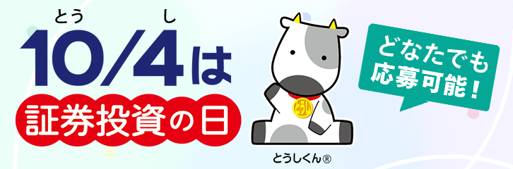 10月4日は、日本証券業協会が定めた証券投資の日!以前より更に身近になったNISAの制度で投資をしている方もこれから始めようとしている方も、マネックス証券のLINE公式アカウントを友だち追加し、キャンペーン申込みページよりお申込みくださった皆さまに、NISAと10月4日の投資の日とかけて213,104円(NISAで投資)分のAmazonギフトカードを山分けでプレゼント!もちろんこれまでに友だち登録してくださった方もトーク画面からお申込みいただければキャンペーンの対象となります!最新のマーケット情報やお得なキャンペーン等配信しておりますので、ぜひこの機会に友だち登録を!